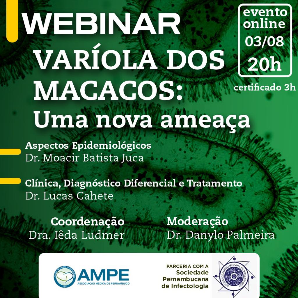 A Associação Médica de Pernambuco (AMPE) e a Sociedade Pernambucana de Infectologia (SBI) – seccional Pernambuco promoverão no dia 03/08 um webinar sobre a varíola dos macacos: Uma nova ameaça. O evento pretende trazer uma abordagem mais aprofundada, além dos desdobramentos mais atuais da doença.
