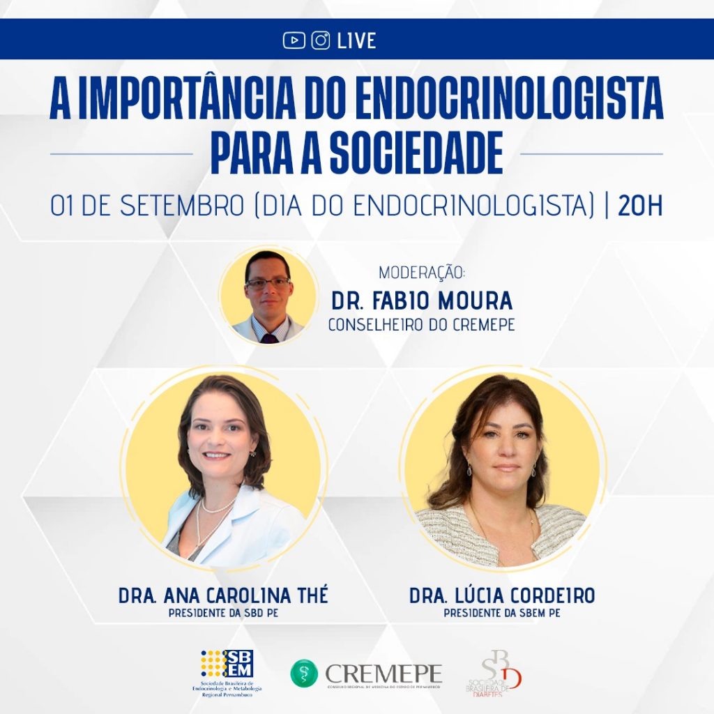 Já está marcada para o dia 1º de setembro, no Dia do Endocrinologista, a live sobre a importância dos especialistas que visam a proteção à saúde, relacionada a hormônios. A reunião online, que será transmitida através das redes sociais do Cremepe e da @sbempe será sobre a importância do endocrinologista para a sociedade com a moderação do conselheiro Fábio Moura e as discussões das presidentes da Sbem, Lúcia Cordeiro, e da Sociedade Brasileira de Diabetes, Ana Carolina Thé. A live começa às 20h, agende-se!