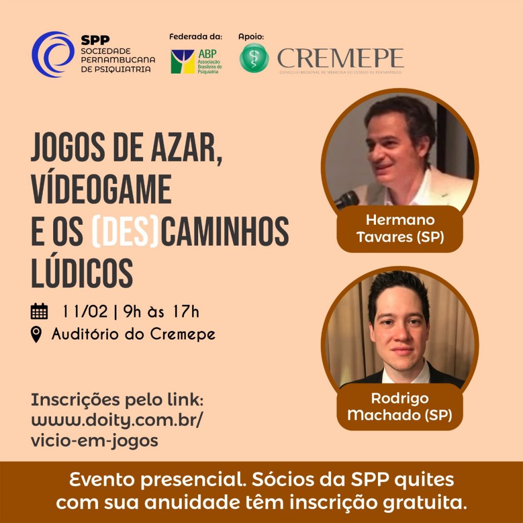 No dia 11 de fevereiro, a Sociedade Pernambucana de Psiquiatria dá início ao calendário de atividades 2023 com o curso “Jogos de Azar, Videogame e os (Des)Caminhos Lúdicos”. A aula acontece das 9h às 17h, no auditório do Conselho Regional de Medicina de Pernambuco (Cremepe), e será ministrada pelos professores Hermano Tavares (SP) e Rodrigo Machado (SP).