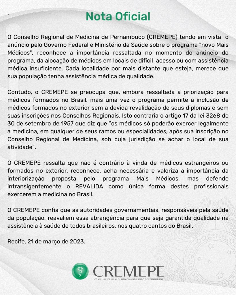 Contudo, o CREMEPE se preocupa que, embora ressaltada a priorização para médicos formados no Brasil, mais uma vez o programa permite a inclusão de médicos formados no exterior sem a devida revalidação de seus diplomas e sem suas inscrições nos Conselhos Regionais. Isto contraria o artigo 17 da lei 3268 de 30 de setembro de 1957 que diz que “os médicos só poderão exercer legalmente a medicina, em qualquer de seus ramos ou especialidades, após sua inscrição no Conselho Regional de Medicina, sob cuja jurisdição se achar o local de sua atividade”.