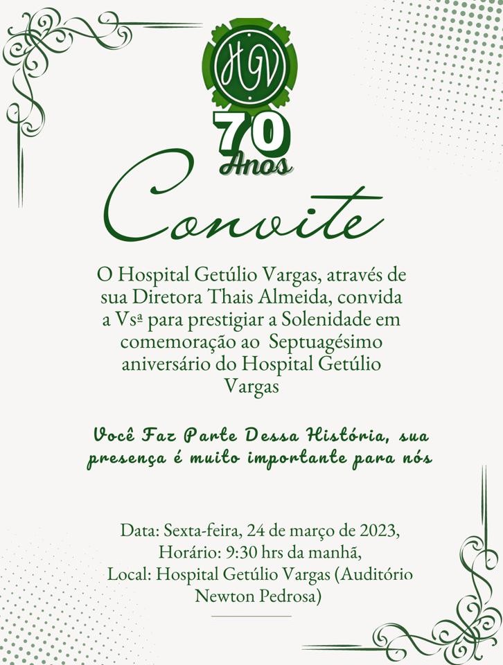 Nesta sexta-feira (24/03), o Hospital Getúlio Vargas estará celebrando seu 70º aniversário. A partir das 9h30, será realizada solenidade de comemoração no Auditório Newton Pedrosa, lá mesmo, no HGV, no bairro do Cordeiro.