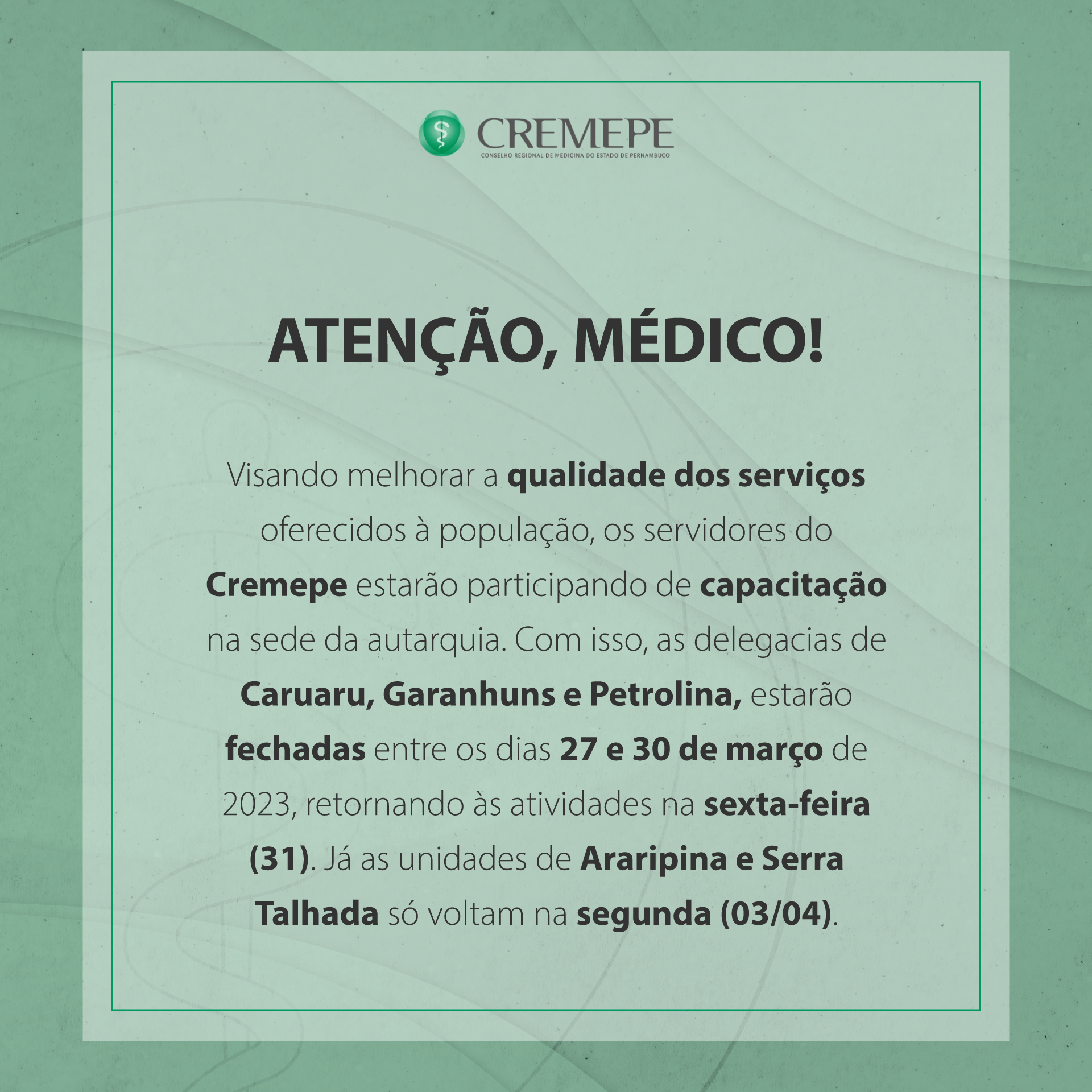 Visando melhorar a qualidade dos serviços oferecidos à população, os servidores do Cremepe estarão participando de capacitação na sede da autarquia. Com isso, as delegacias de Caruaru, Garanhuns e Petrolina, estarão fechadas entre os dias 27 e 30 de março de 2023, retornando às atividades na sexta-feira (31). Já as unidades de Araripina e Serra Talhada só voltam ao funcionamento normal na segunda (03/04).