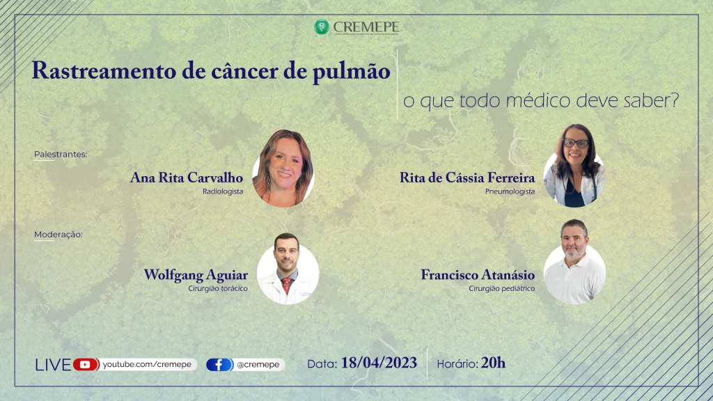 O Conselho Regional de Medicina de Pernambuco (Cremepe) promoverá na próxima terça-feira (18/04) a live: “Rastreamento de câncer de pulmão – o que todo médico deve saber”. O encontro virtual contará com a moderação do conselheiro do Cremepe e cirurgião, Francisco Atanásio e do cirurgião torácico, Wolfgang Aguiar. As palestras serão realizadas pela radiologista, Ana Rita Carvalho e pela pneumologista, Rita de Cássia Ferreira. A live será transmitida através do canal do Cremepe no Youtube e na página no Facebook da autarquia, a partir das 20h.