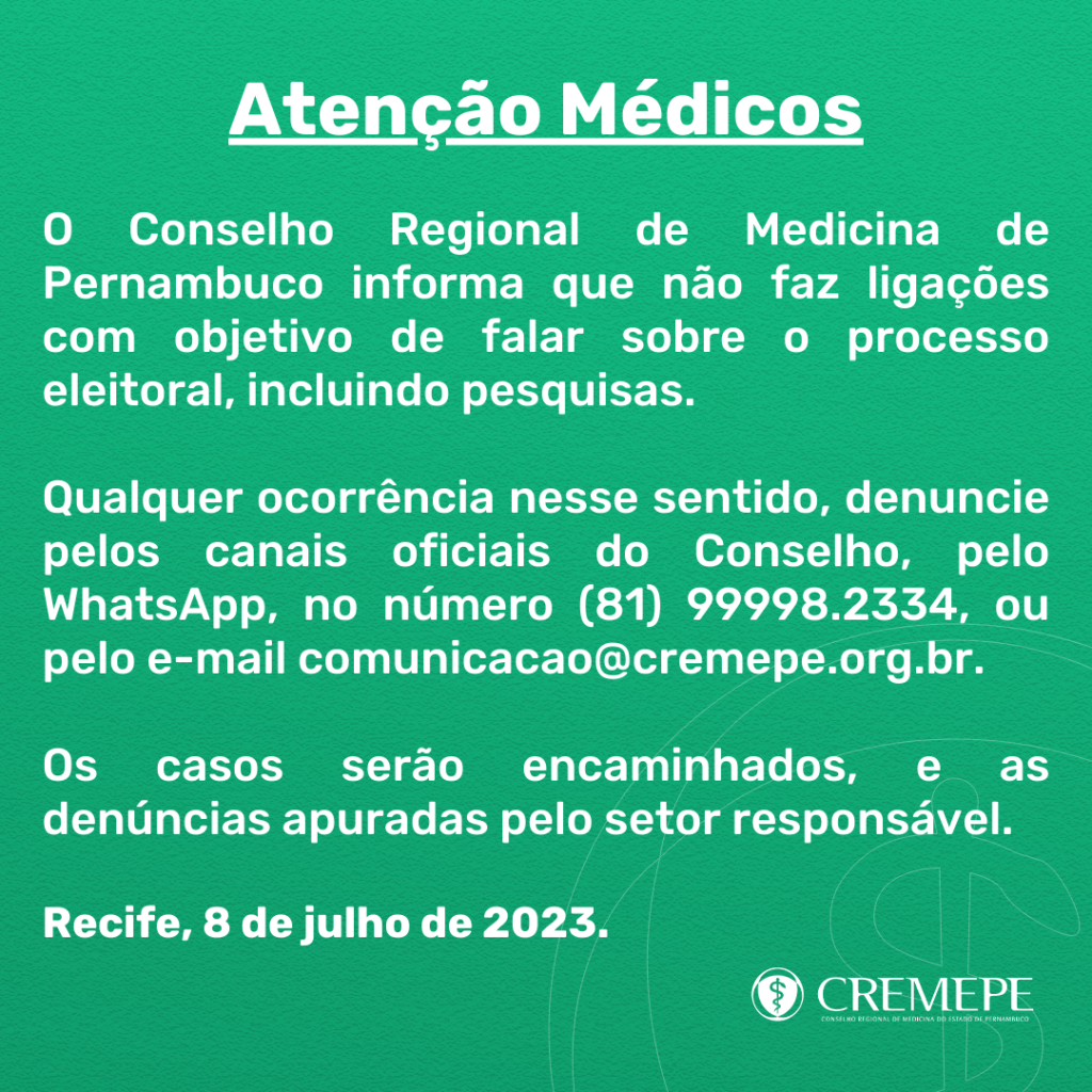 O Conselho Regional de Medicina de Pernambuco informa que não faz ligações com objetivo de falar sobre o processo eleitoral, incluindo pesquisas.