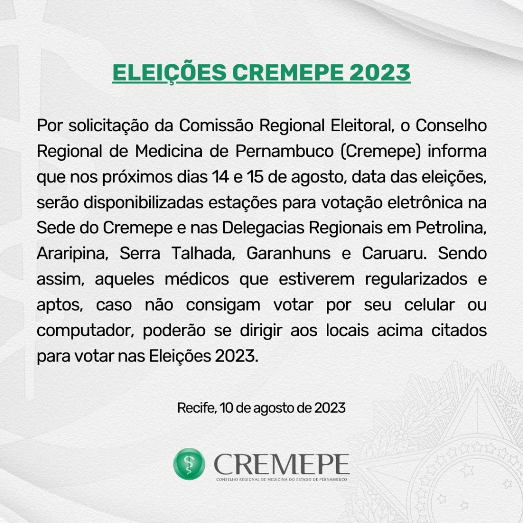 Por solicitação da Comissão Regional Eleitoral, o Conselho Regional de Medicina de Pernambuco (Cremepe) informa que nos próximos dias 14 e 15 de agosto, data das eleições, serão disponibilizadas estações para votação eletrônica na Sede do Cremepe e nas Delegacias Regionais em Petrolina, Araripina, Serra Talhada, Garanhuns e Caruaru. Sendo assim, aqueles médicos que estiverem regularizados e aptos, caso não consigam votar por seu celular ou computador, poderão se dirigir aos locais acima citados para votar nas Eleições 2023.
