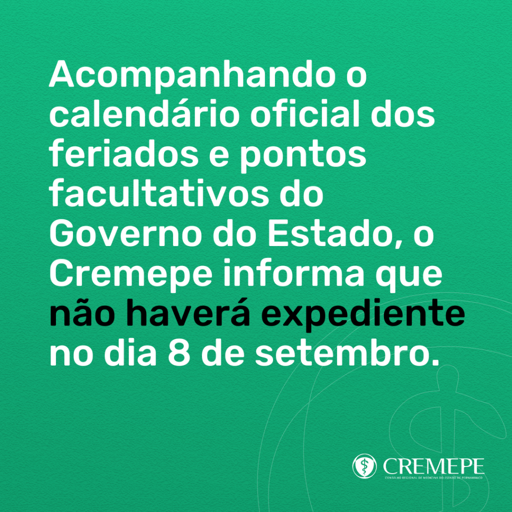 De acordo com a Portaria nº 536/2023, o Conselho Regional de Medicina de Pernambuco (Cremepe) informa que, seguindo o calendário oficial dos feriados e pontos facultativos do Governo do Estado, não haverá expediente nesta autarquia no dia 08/09/2023.
