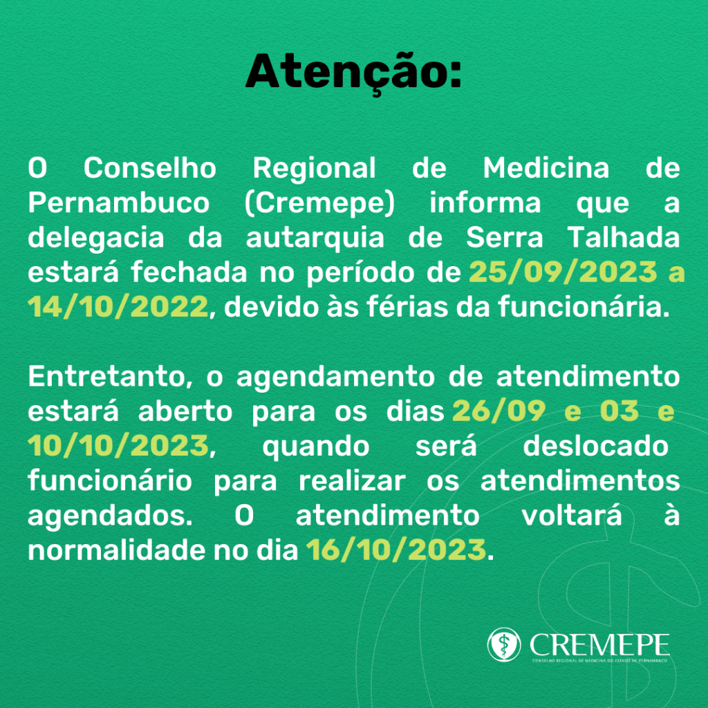 O Conselho Regional de Medicina de Pernambuco (Cremepe) informa que a delegacia da autarquia de Serra Talhada estará fechada no período de 25/09/2023 a 14/10/2022, devido às férias da funcionária. Entretanto, o agendamento de atendimento estará aberto para os dias 26/09 e 03 e 10/10/2023, quando será deslocado funcionário para realizar os atendimentos agendados. O atendimento voltará à normalidade no dia 16/10/2023.