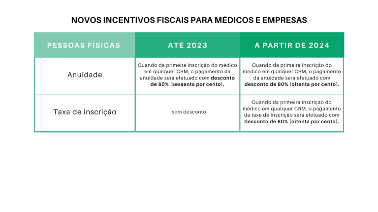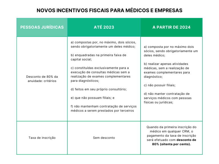 A nova regra também flexibilizou os critérios para a concessão do desconto na anuidade das pessoas jurídicas. Até ano passado, a empresa teria de ser enquadrada na primeira faixa de capital social (de até R$ 50 mil) e ter sido criada apenas para consultas médicas realizadas no consultório. Agora, não há limite para o capital social e serviços prestados em qualquer lugar, mesmo em consultório não próprio.