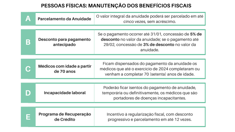 Isenções – O orçamento do próximo ano manteve benefícios já dados em anos anteriores, como a isenção da anuidade para os médicos acima de 70 anos (mesmo que venham a completar a idade no decorrer do ano) e, também, para os portadores de doenças incapacitantes, como Parkinson, cardiopatia grave, esclerose múltipla, entre outras. Também foi mantido o programa de recuperação de crédito, com incentivo à regularização fiscal que prevê desconto progressivo e parcelamento em até 12 vezes.