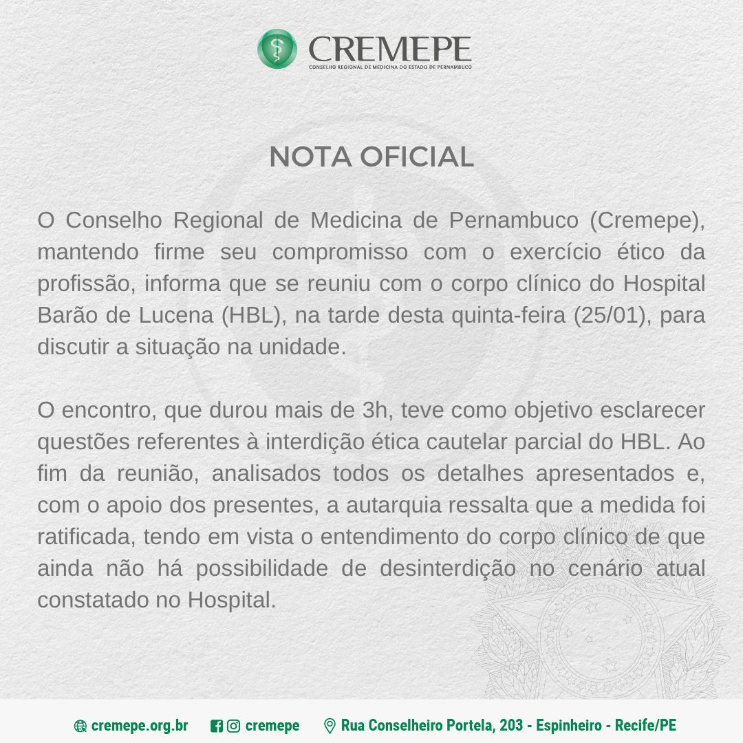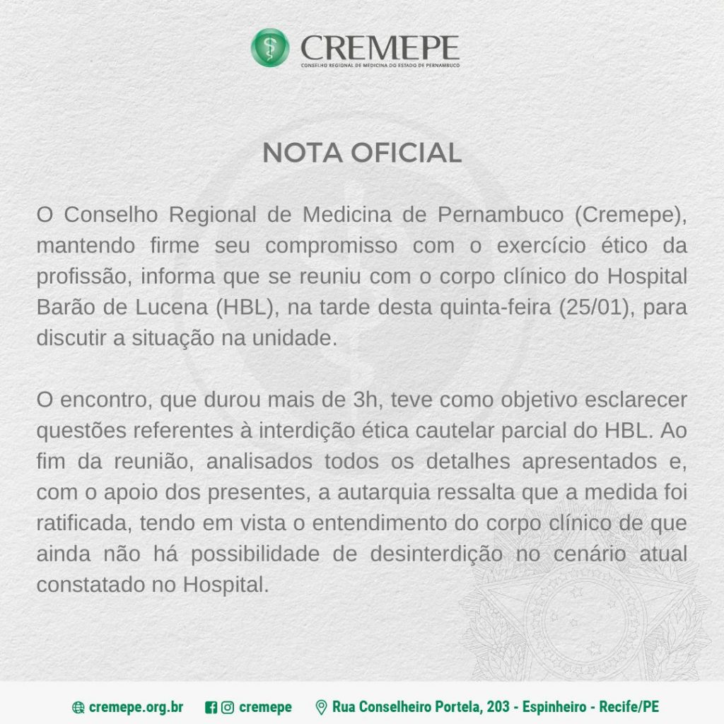 O Conselho Regional de Medicina de Pernambuco (Cremepe), mantendo firme seu compromisso com o exercício ético da profissão, informa que se reuniu com o corpo clínico do Hospital Barão de Lucena (HBL), na tarde desta quinta-feira (25/01), para discutir a situação na unidade.
