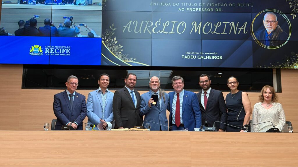 O conselheiro e diretor da Escola Superior de Ética Médica (ESEM) do Cremepe, Agostinho Machado, representou a autarquia na cerimônia de entrega do Título de Cidadão do Recife ao Professor Aurélio Molina, realizada na manhã desta sexta-feira (15/08). A solenidade aconteceu no Plenário da Câmara Municipal do Recife, por iniciativa do vereador e médico Tadeu Calheiros.