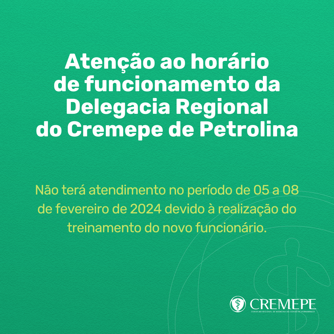 Atenção aos horários de funcionamento das Delegacias Regionais do Conselho Regional de Medicina de Pernambuco (Cremepe): Petrolina: Atendimento…