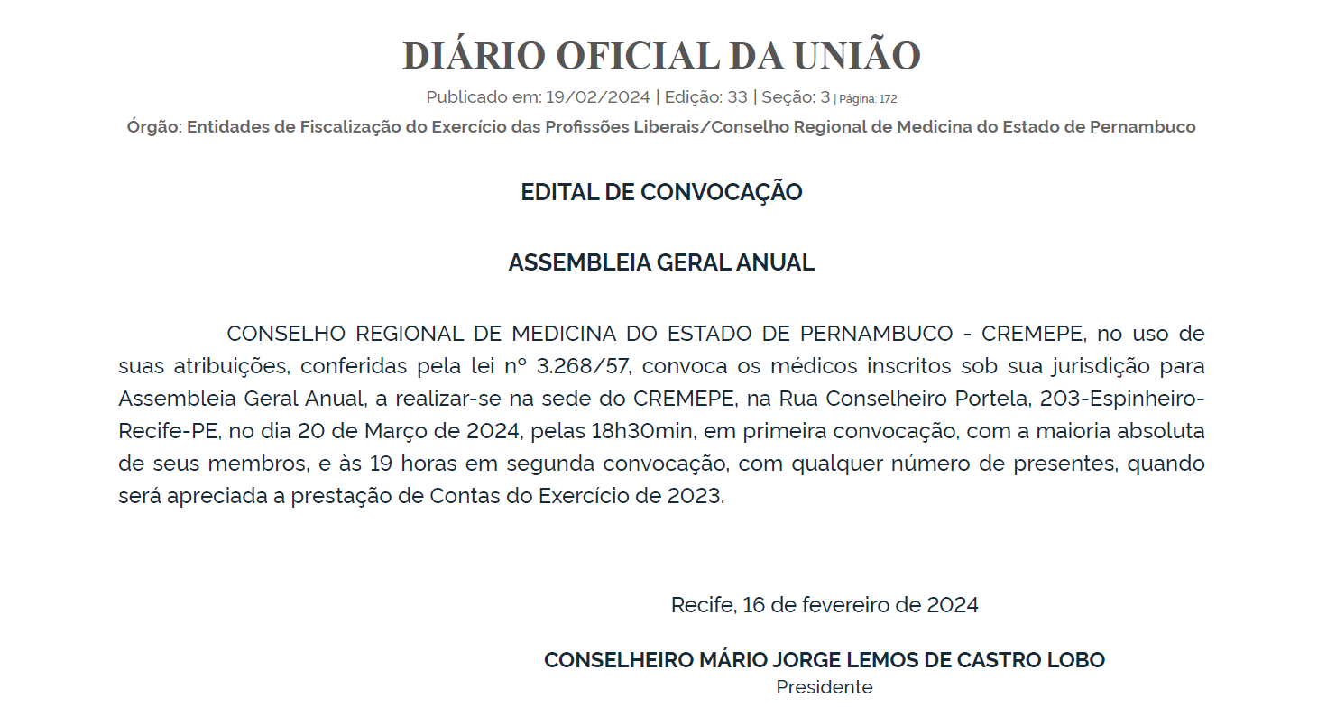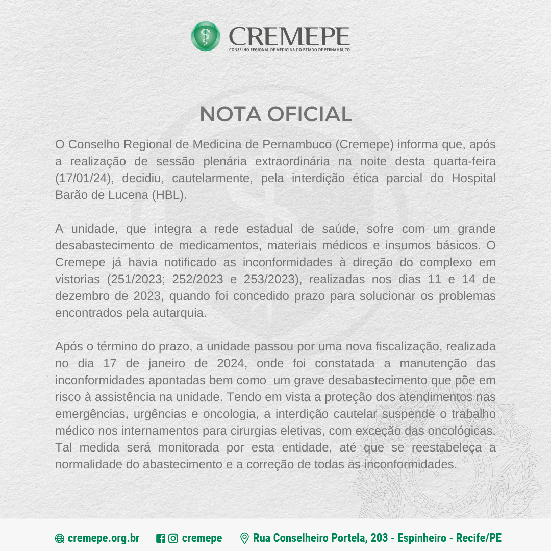 O Conselho Regional de Medicina de Pernambuco (Cremepe) informa que está suspenso, até o dia 20 de janeiro…