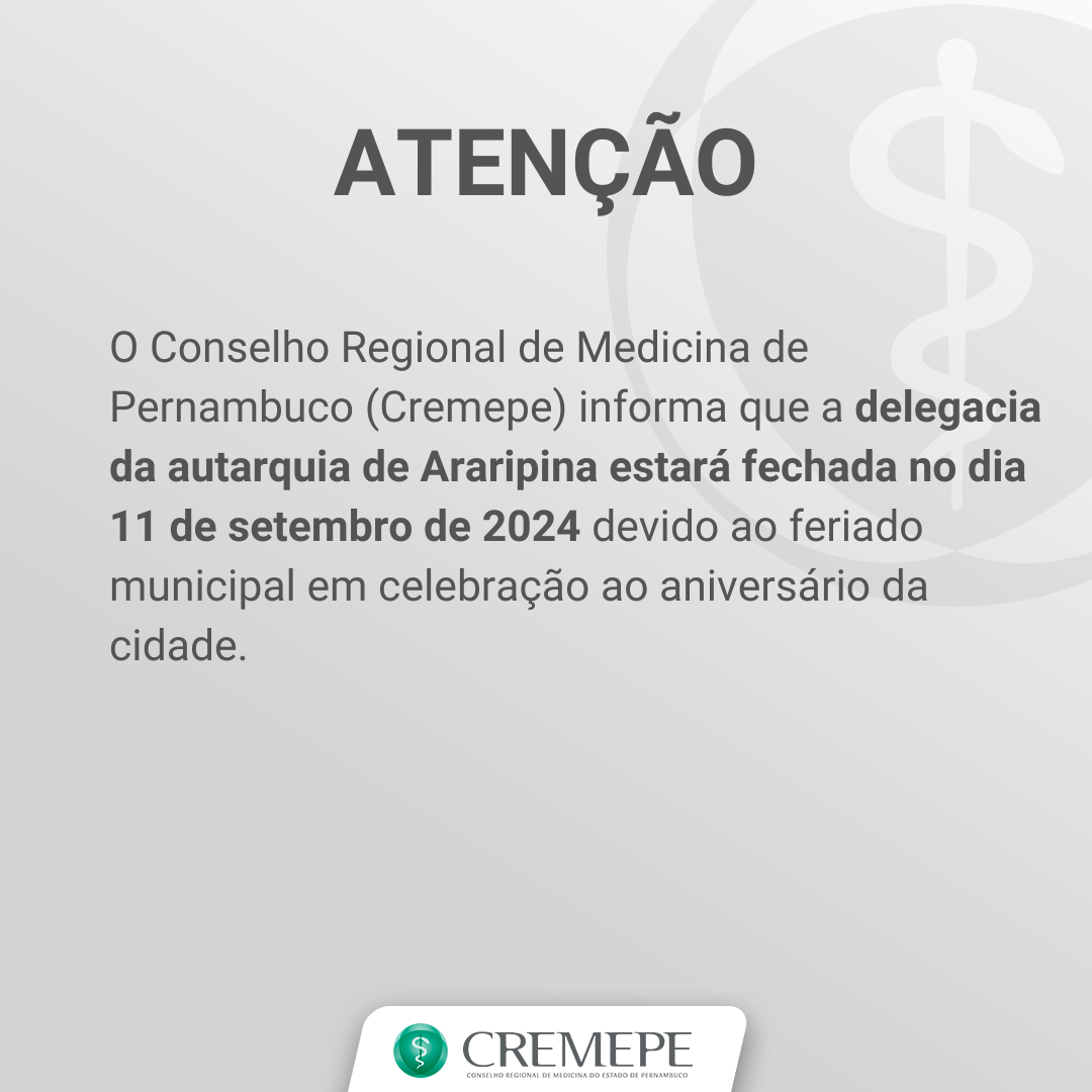 O Conselho Regional de Medicina de Pernambuco (Cremepe) informa que sua sede (Recife) e delegacias regionais não funcionarão…