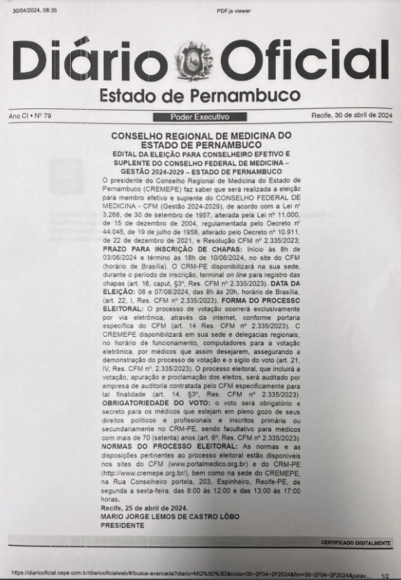 EDITAL DA ELEIÇÃO PARA CONSELHEIRO EFETIVO E SUPLENTE DO CONSELHO FEDERAL DE MEDICINA – GESTÃO 2024-2029 – ESTADO DE PERNAMBUCO