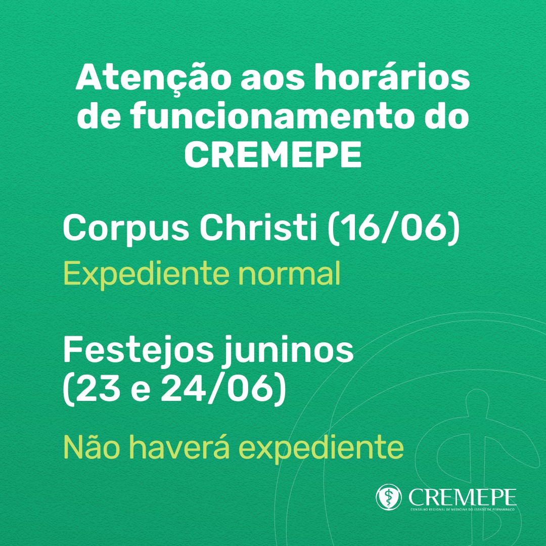 O Conselho Regional de Medicina de Pernambuco (Cremepe) informa que 16 de junho, Corpus Christi, o expediente da…