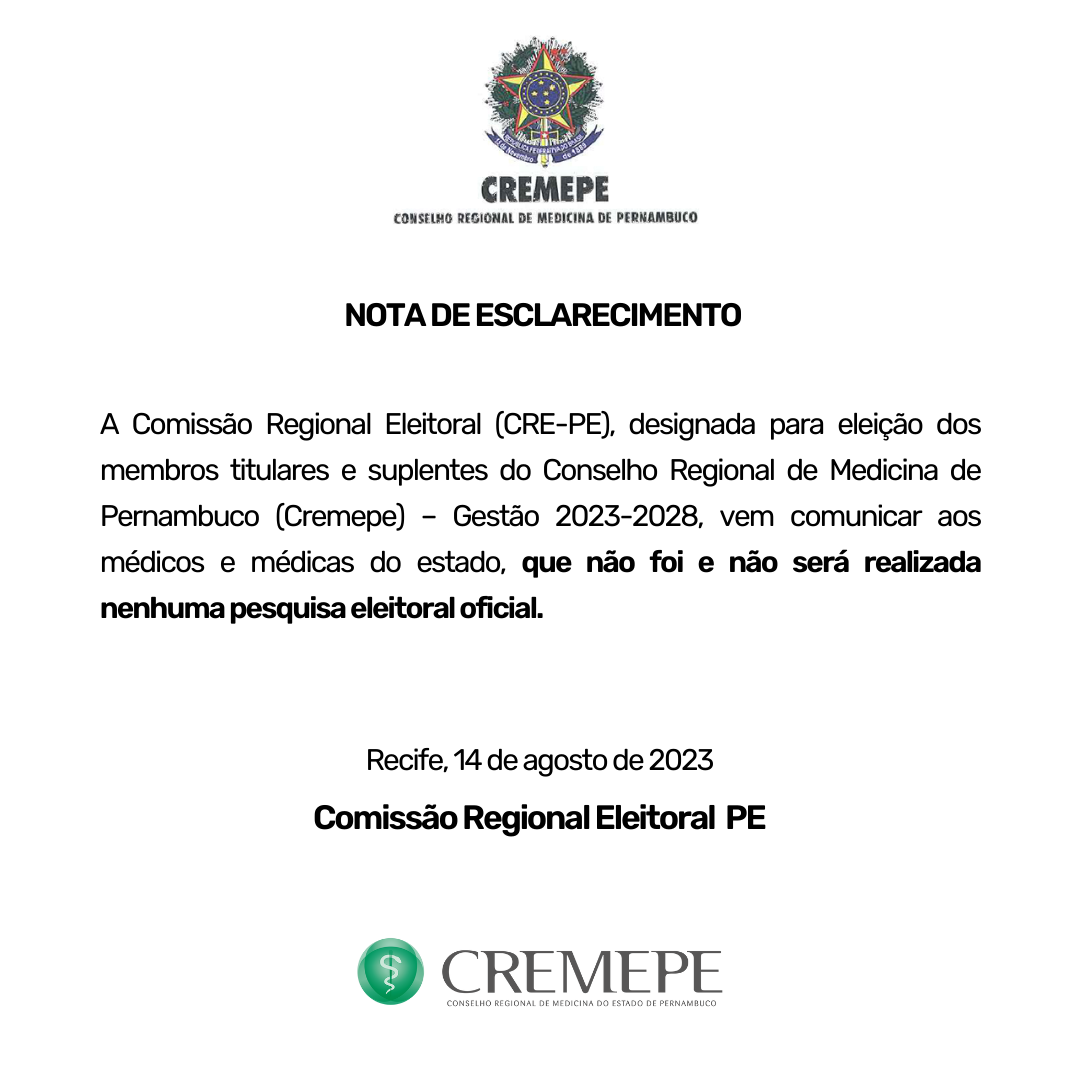 Por solicitação da Comissão Regional Eleitoral, o Conselho Regional de Medicina de Pernambuco (Cremepe) informa que nos próximos…