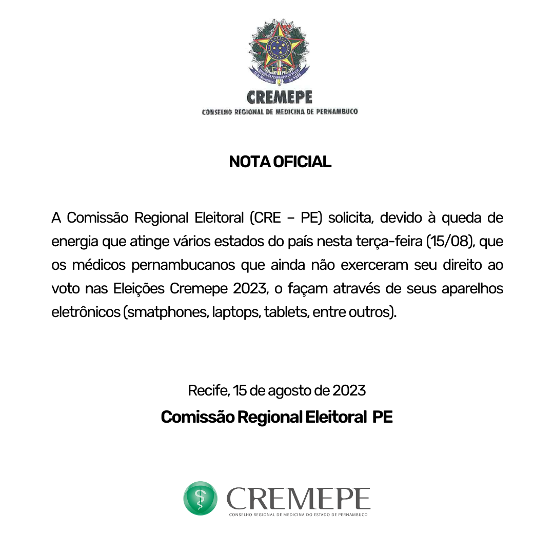 A Comissão Regional Eleitoral (CRE – PE) solicita, devido à queda de energia que atinge vários estados do…