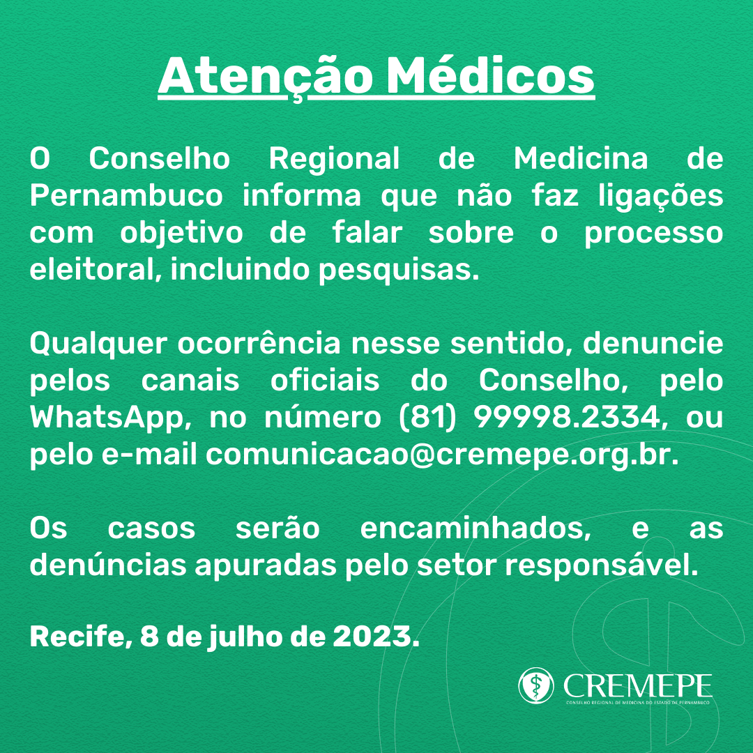 Atenção Médicos! O Conselho Regional de Medicina de Pernambuco informa que não faz ligações com objetivo de falar…