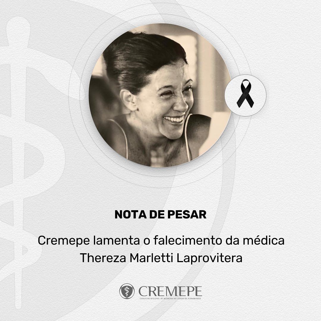 O Conselho Regional de Medicina de Pernambuco (Cremepe) lamenta profundamente o falecimento da médica anestesiologista, Thereza Marletti Laprovitera,…
