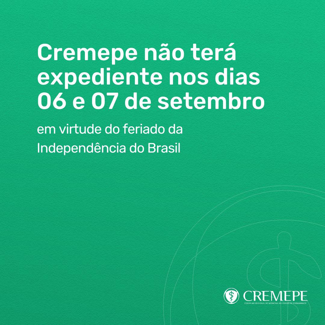 O Conselho Regional de Medicina de Pernambuco (Cremepe) informa que, em virtude do feriado nacional da Independência do…