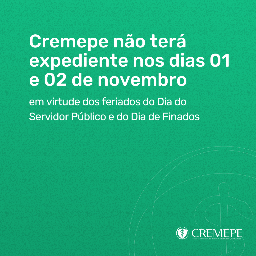 O Conselho Regional de Medicina de Pernambuco (Cremepe) informa que, em virtude do feriado de Finados, não haverá…