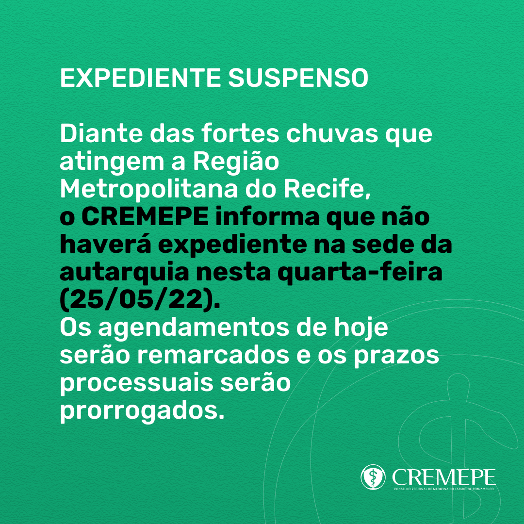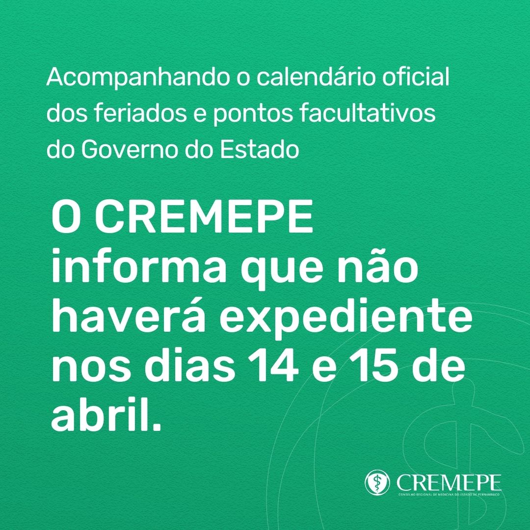 A diretoria do Conselho Regional de Medicina de Pernambuco (Cremepe) informa que não haverá expediente no Conselho entre os…
