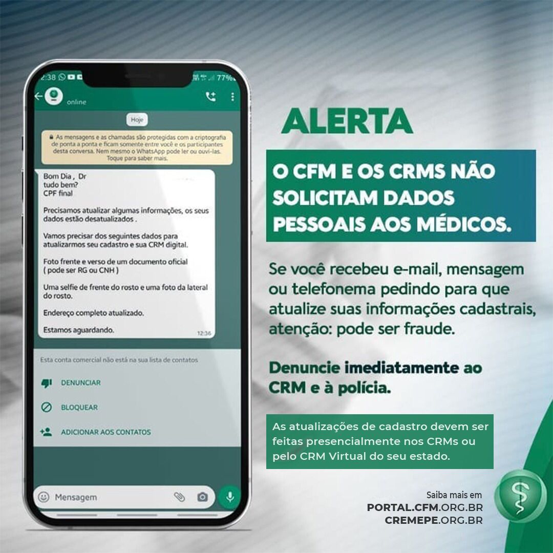 Golpistas estão abordando médicos de todo o país solicitando o envio de dados cadastrais e fotos para suposta…