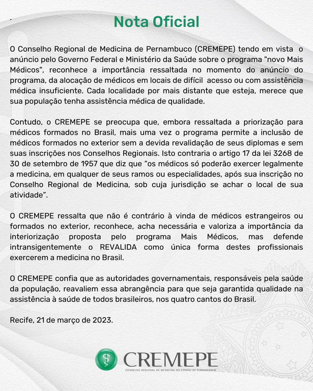 O Conselho Regional de Medicina de Pernambuco (CREMEPE) tendo em vista o anúncio pelo Governo Federal e Ministério…